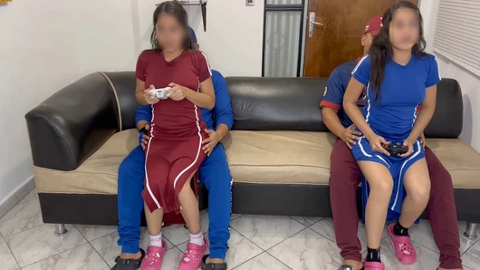 Девушка играет в видеоигры, сидя на ногах старого извращенца, который использует ее невинность
