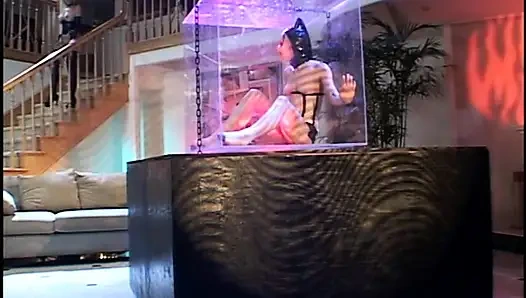 Three gorgeous sluts in latex costumes and two horny guys are having a costume sex party in the living room